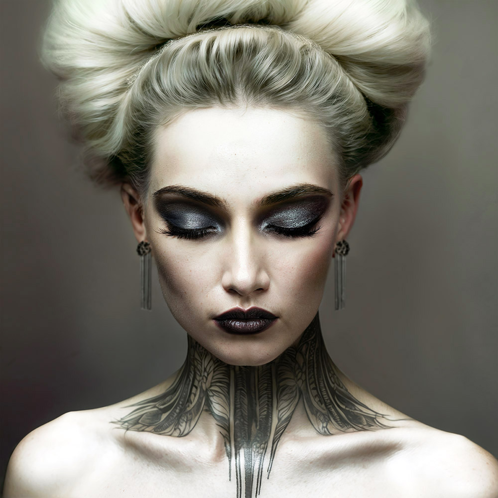 We went over several hair styles and finally settled on sculpting it into a beautiful cotton bun that we managed to hold together with a thin hairnet which - if you look closely - you can still see in the final photo. The tattoo is almost alien-like, an intentional contrast to the era of Marie-Antoinette. We complemented vertical lines in the tattoo with black flower earrings with small pendant chain dangles. They are the perfect find.