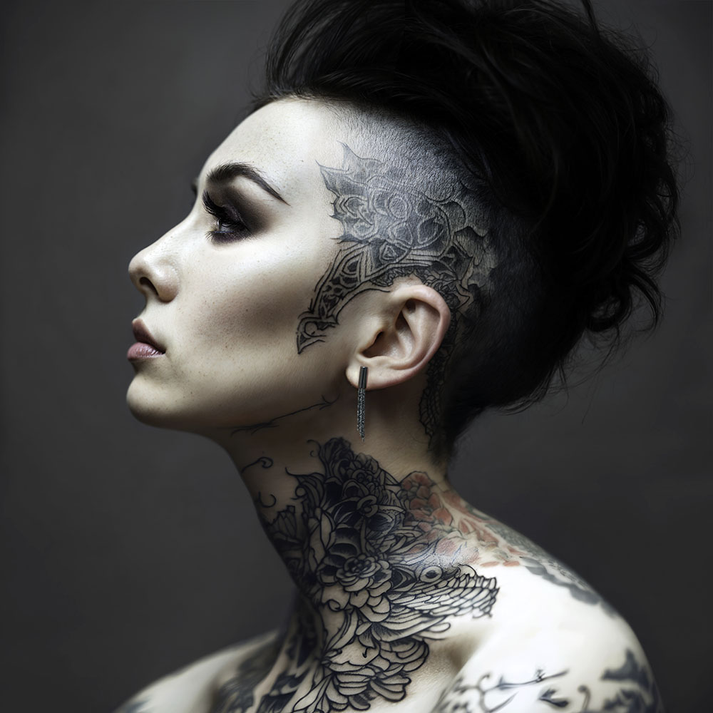 Naturally, I required a rebellious looking model, hairstyle and design matching tattoos - after all a woman like this would not be someone to toy with.