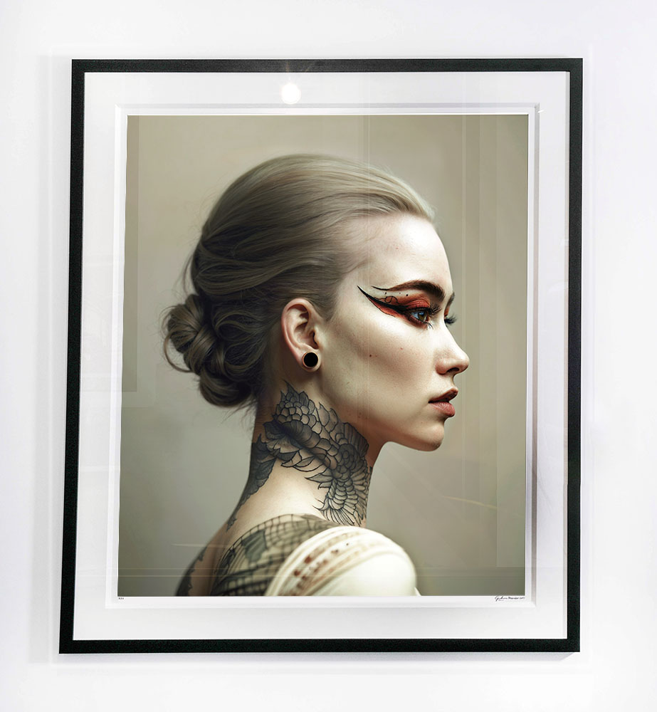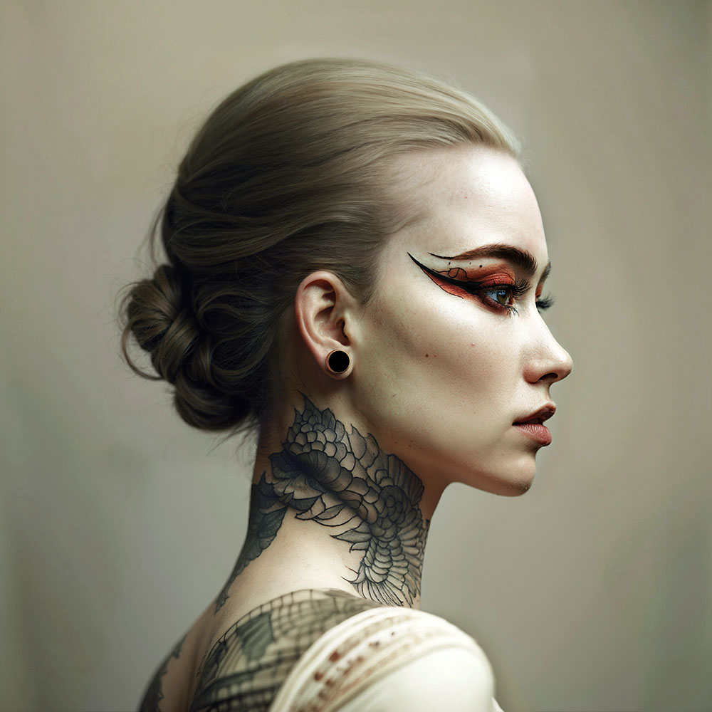 So this is no monochrome Whitey Bulger or Machine Gun Kelly. We have never before seen such desirable faces on wanted posters, let alone with such elaborate hair, makeup and tattoos. Most of these are, as I described elsewhere, temporary transfer tattoos. I design these on my computer before printing them in-house. There's no other way for me to get the look I want.